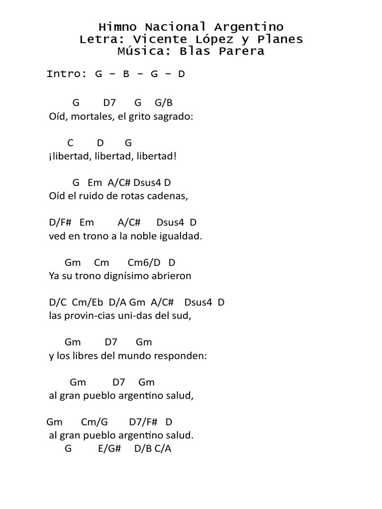 Al gran pueblo argentino, ¡salud! Letra completa en sus dos versiones. *em/g (sin tocar la nota si) *ebm/gb (sin tocar la nota sib) *dm/f (sin tocar la nota la) oíd, mortales, el grito sagrado: Himnos de países himno nacional argentino (completo). Y los libres del mundo responden